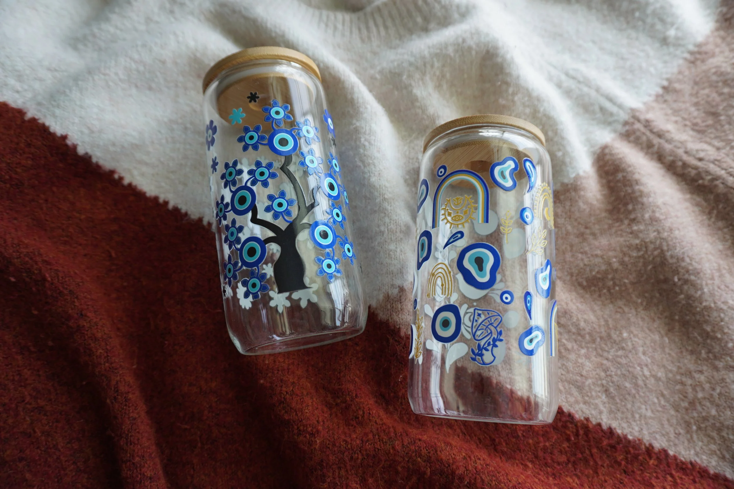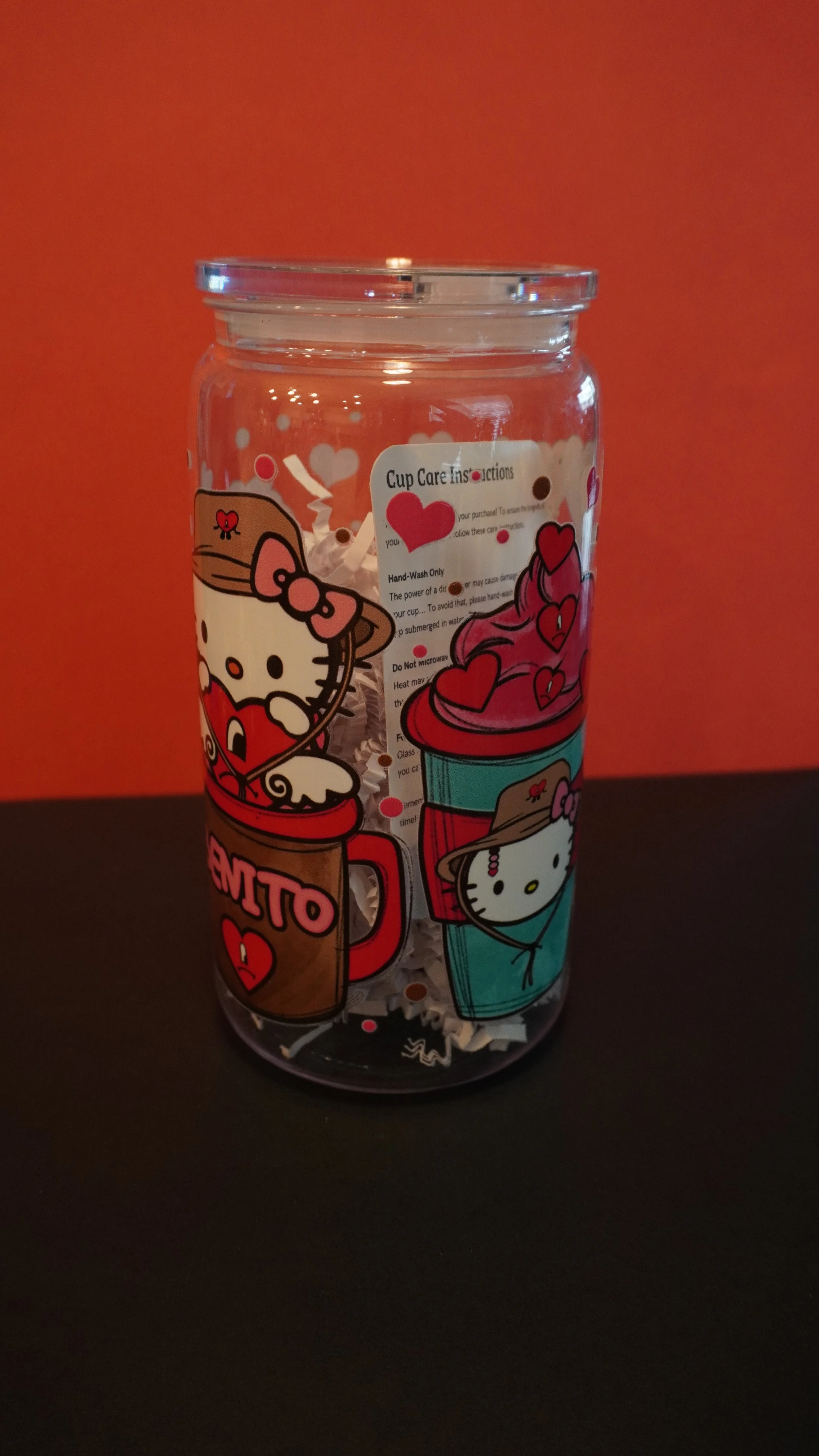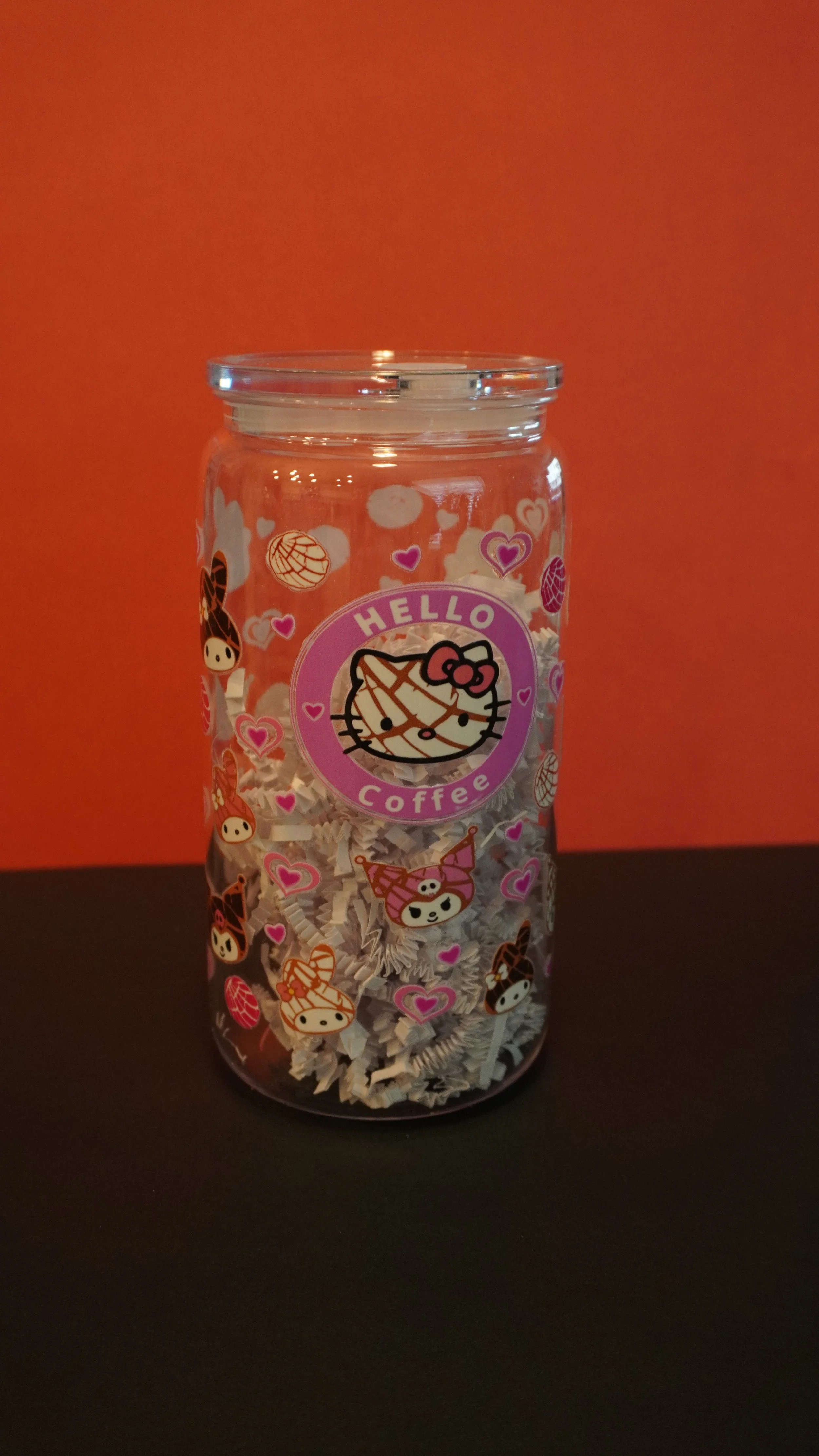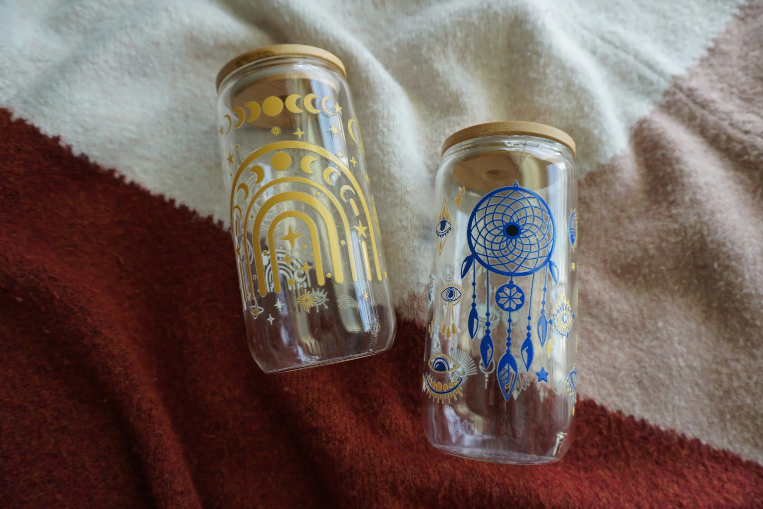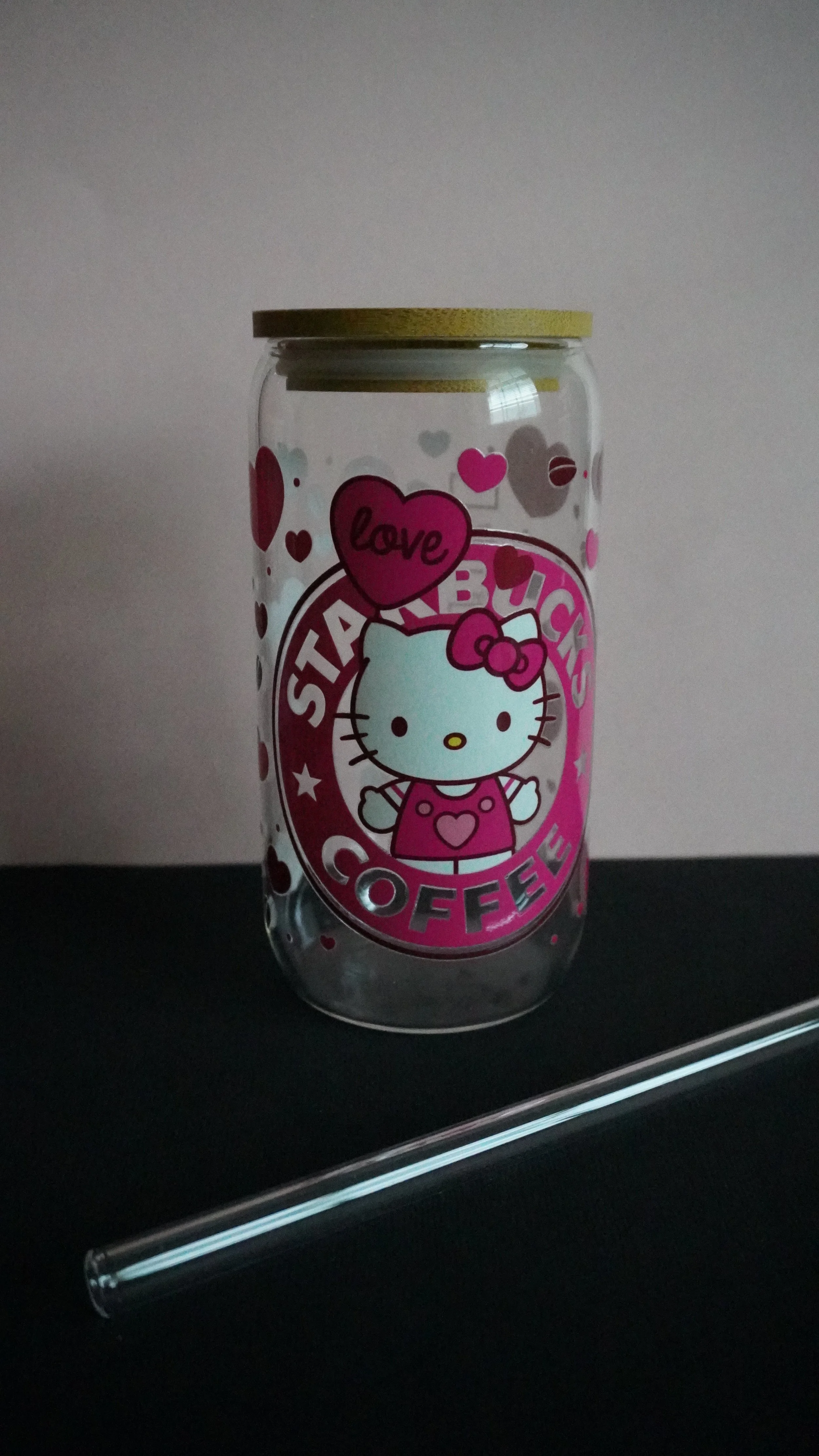 16oz glass cups decorated with UVDTF coffee themed designs! Each cup comes with a bamboo lid and a glass straw~ Hand wash only, not microwave safe