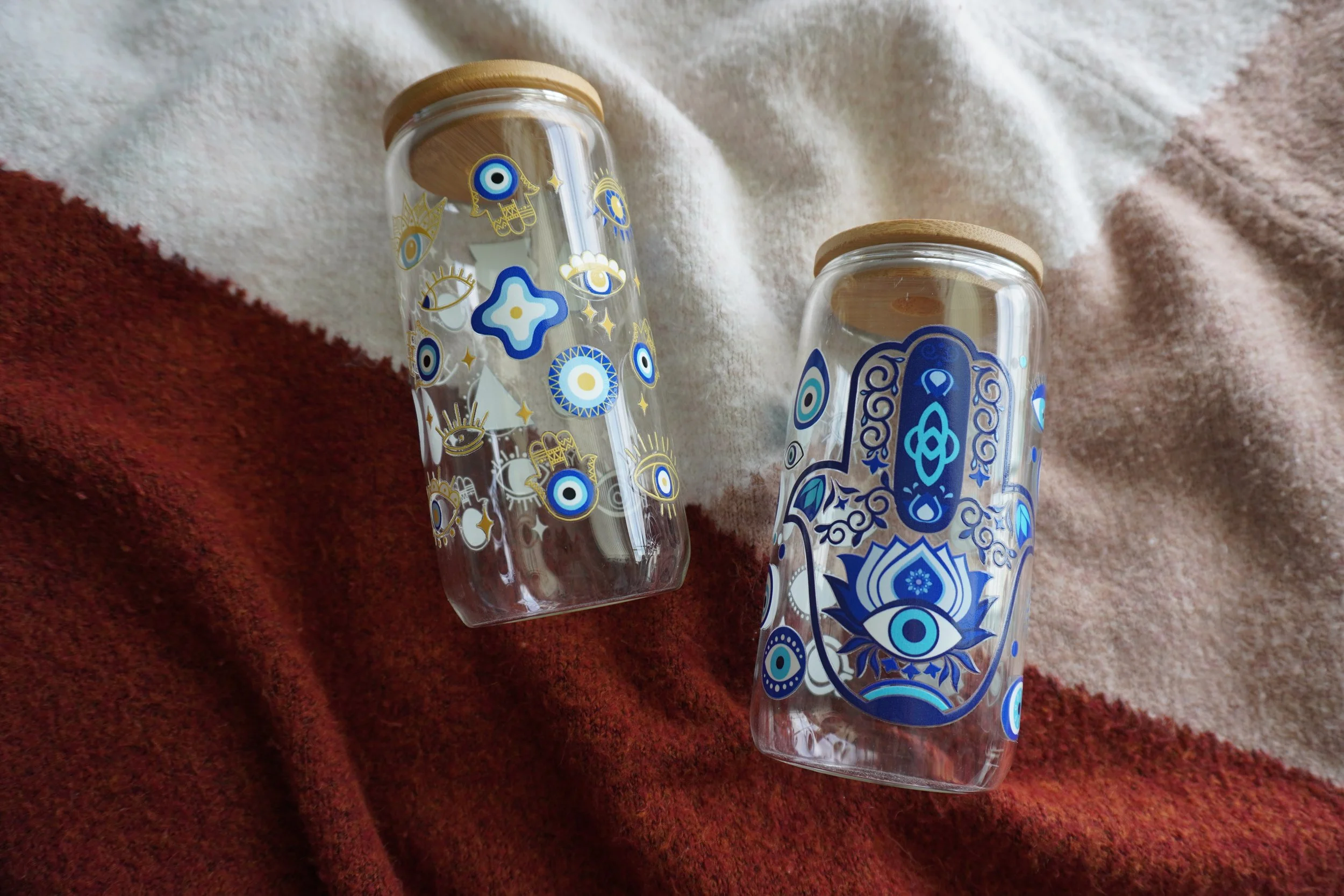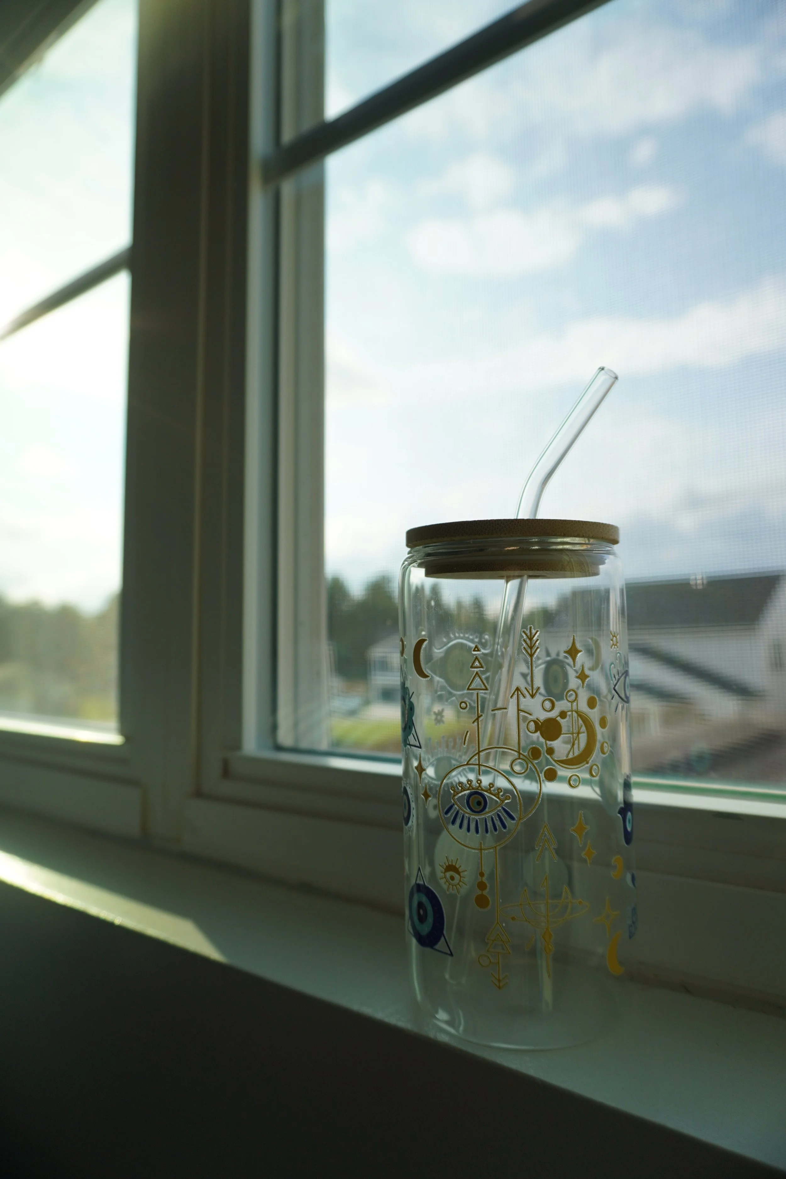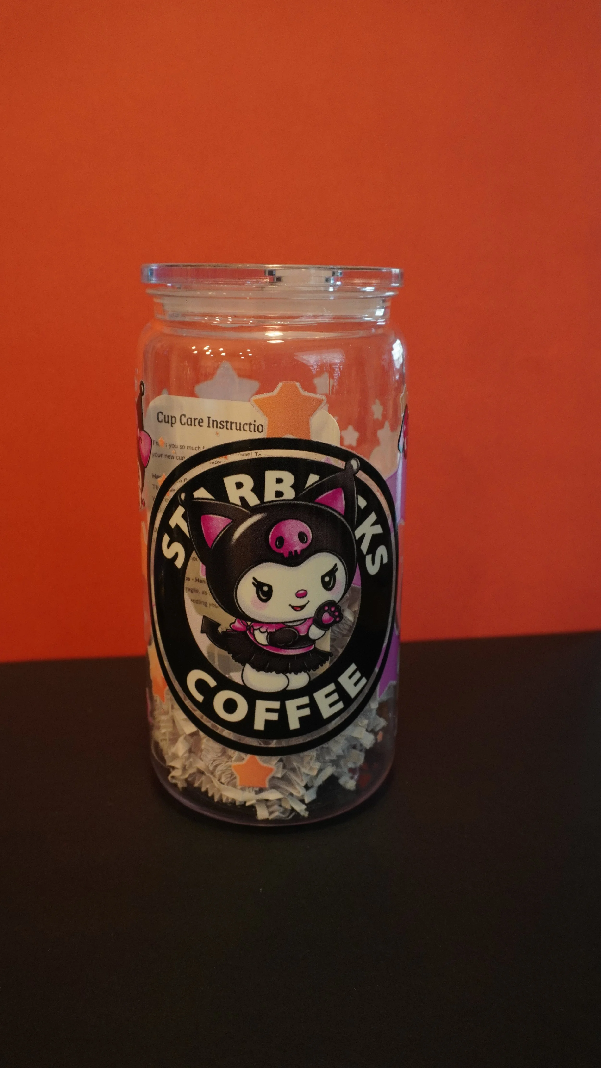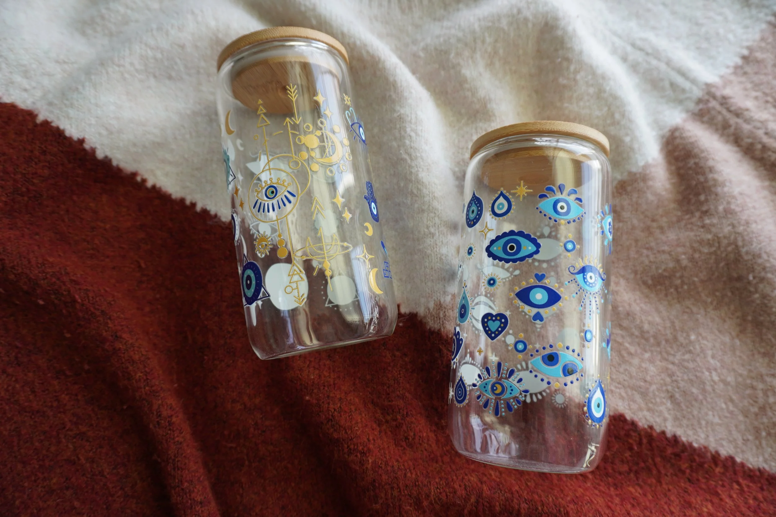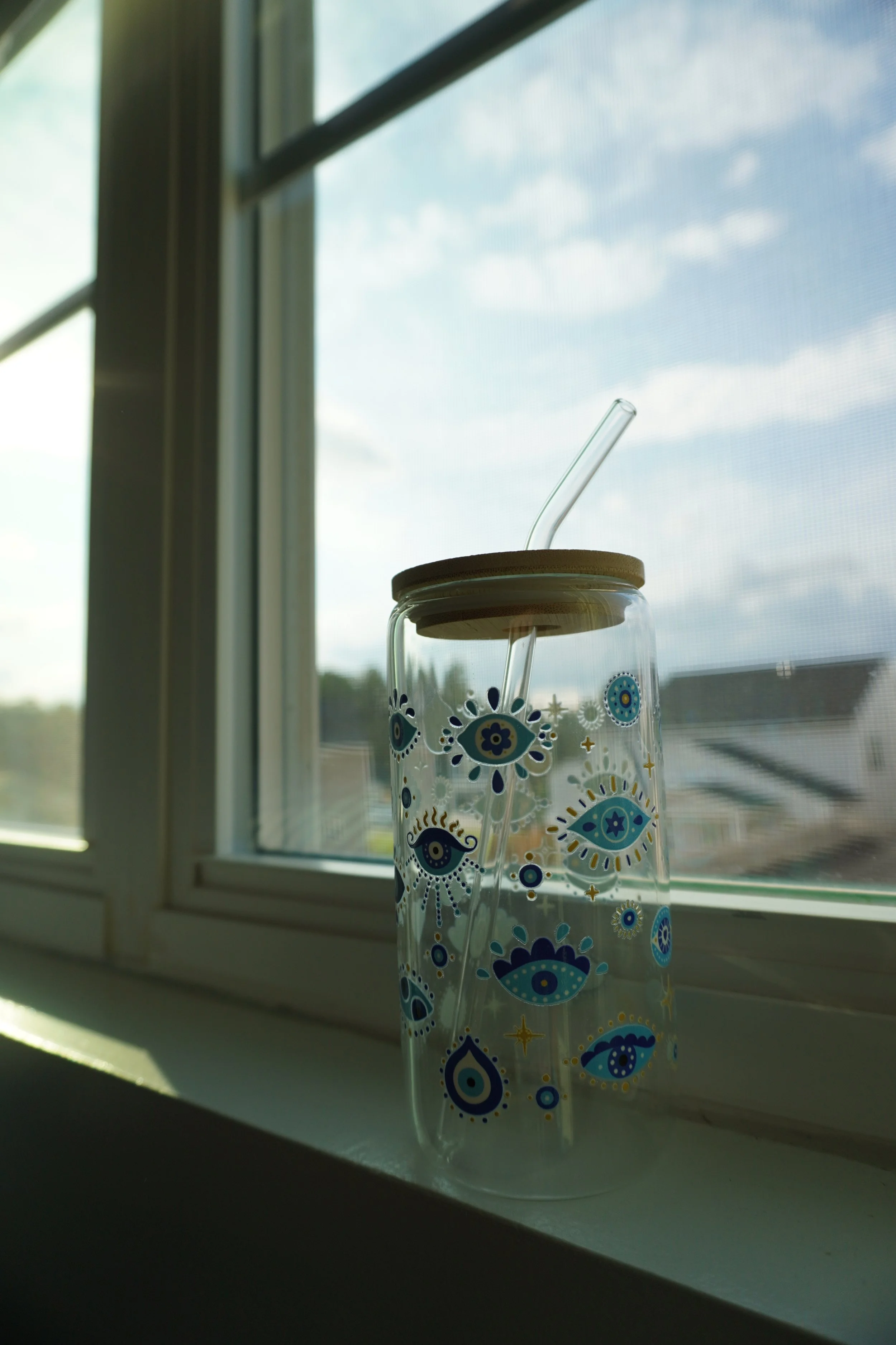 16oz glass cups decorated with UVDTF coffee themed designs! Each cup comes with a bamboo lid and a glass straw~ Hand wash only, not microwave safe
